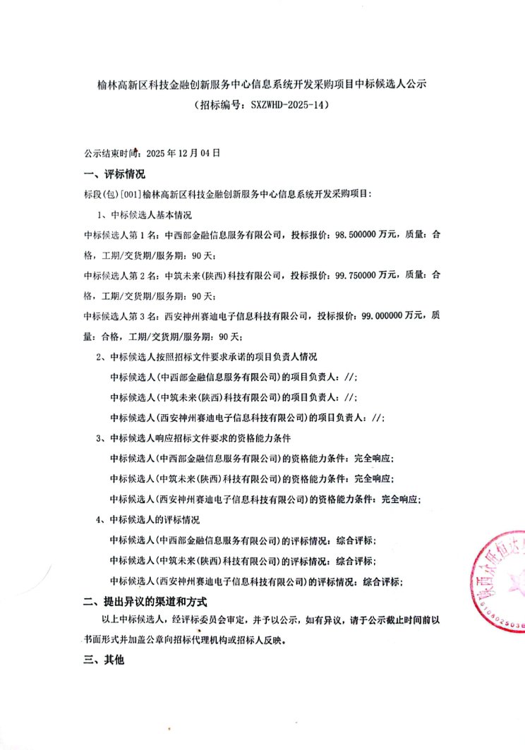 榆林高新区科技金融创新服务中心信息系统开发采购项目中标候选人公示